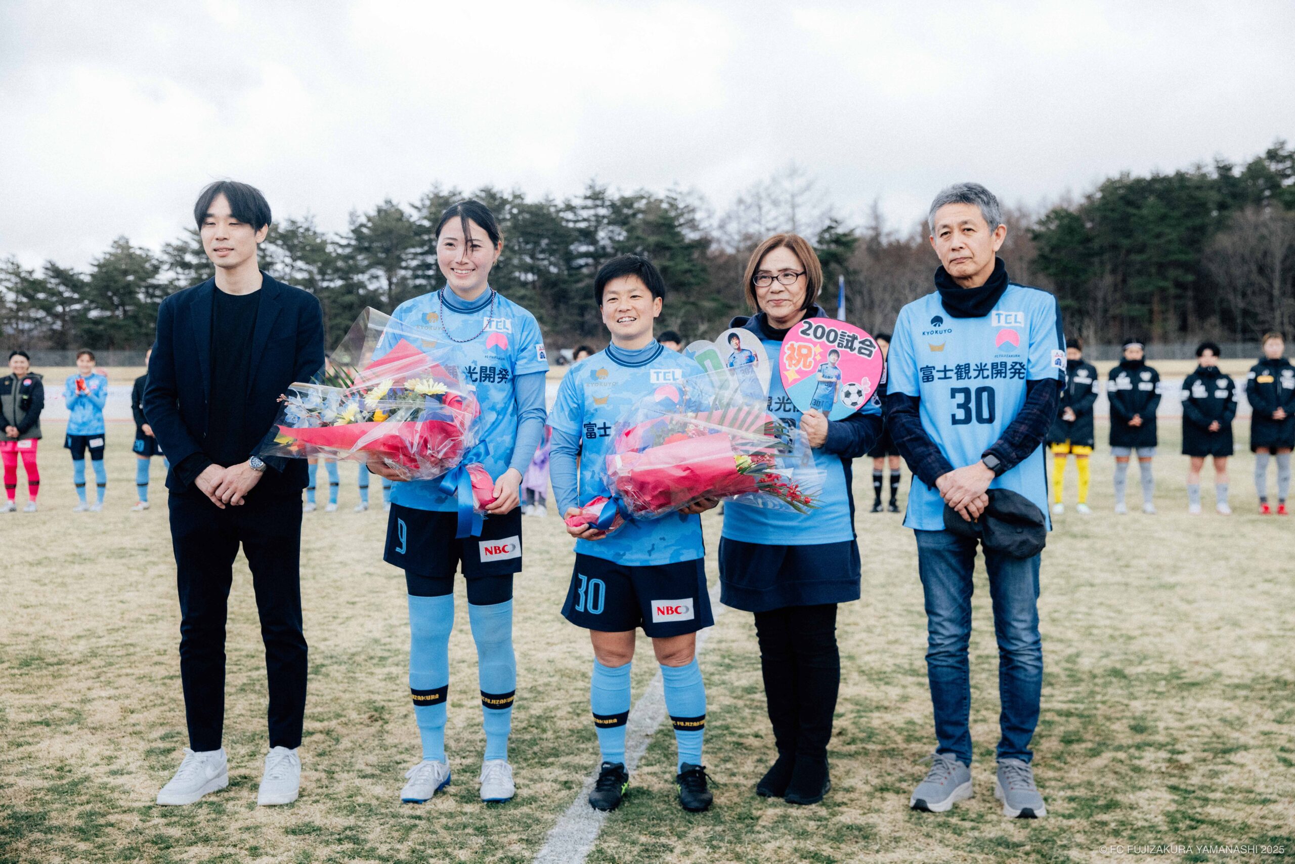 試合前には、前節でなでしこリーグ通算200試合出場を達成した保坂と150試合出場を達成した山本のセレモニーが行われました。
